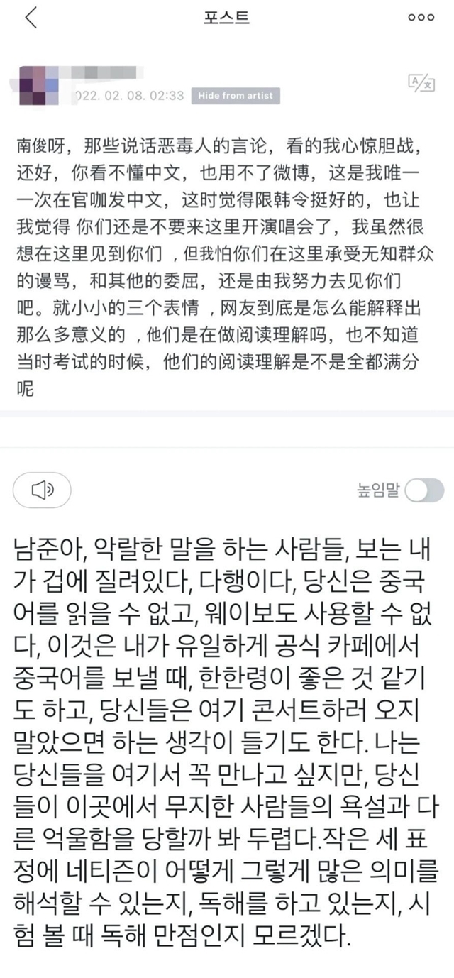당신들이 중국에서 억울한 일을 당할까 봐 두렵다."