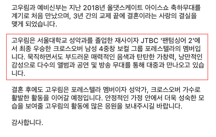 고우림도 업계에서 나름 이름있는 가수인데상대가 상대다보니 입장문에서 경력사항을 올려야 함ㅋㅋ이제 김연아 남편으로 더 유명해지겠지?장윤정 남편, 도경완입니다~백종원 아내, 소유진입니다~김연아 남편, 고우림입니다~
