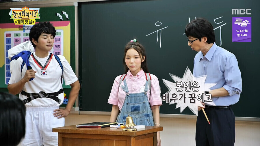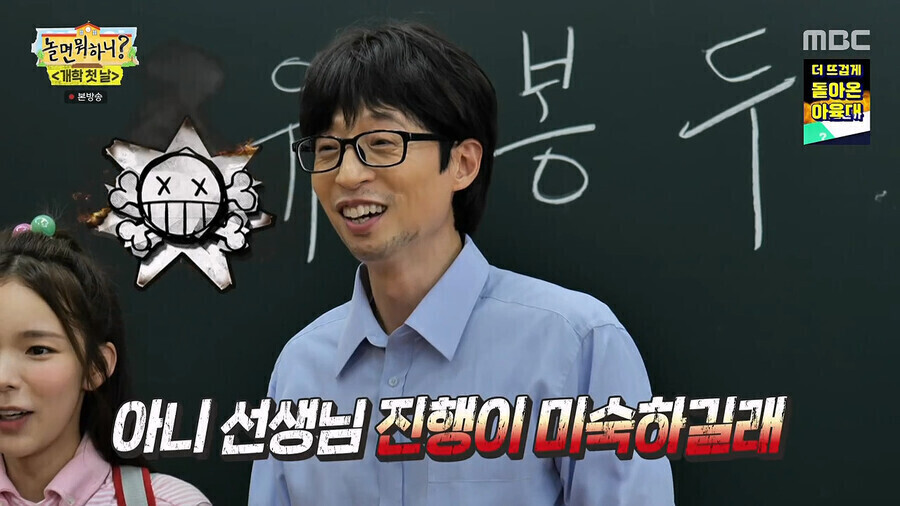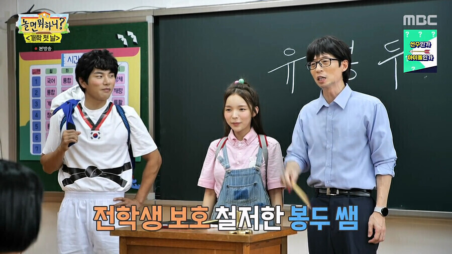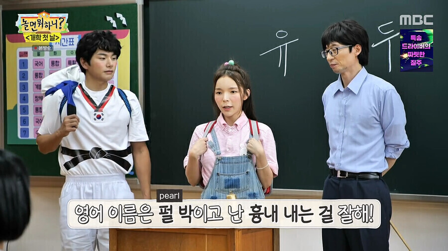 유봉두 선생님의 이름이 야하다고도한 준하학생,이름의 봉자를 빼면 유두~라나 뭐라나~? 그 말을 듣고는 ㅋㅋ묘한 미소를짓는 미주학생~^^{이모티콘:onion-021.gif:50}남도(?)에서 전학온 진주학생은 의외로 철학(?)에 관심이 많은듯한 멘트~