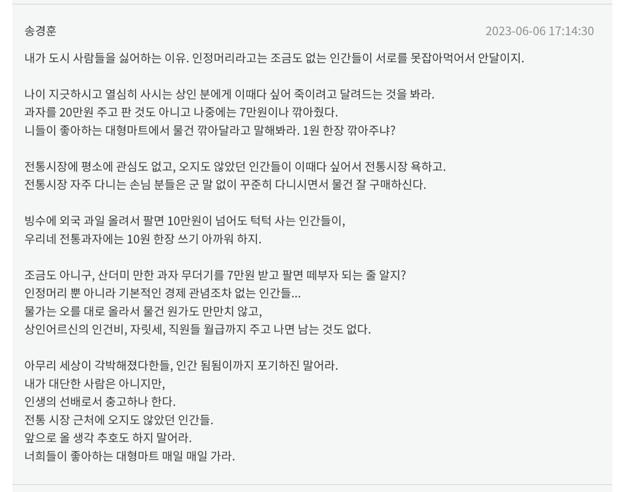 기본적인 경제 관념조차 없는 인간들 -> 전국의 다른 시장들과 비교해도 값이 비싸 해당 사건이 일어났는데 누구한테 경제 관념을 운운하는지.
