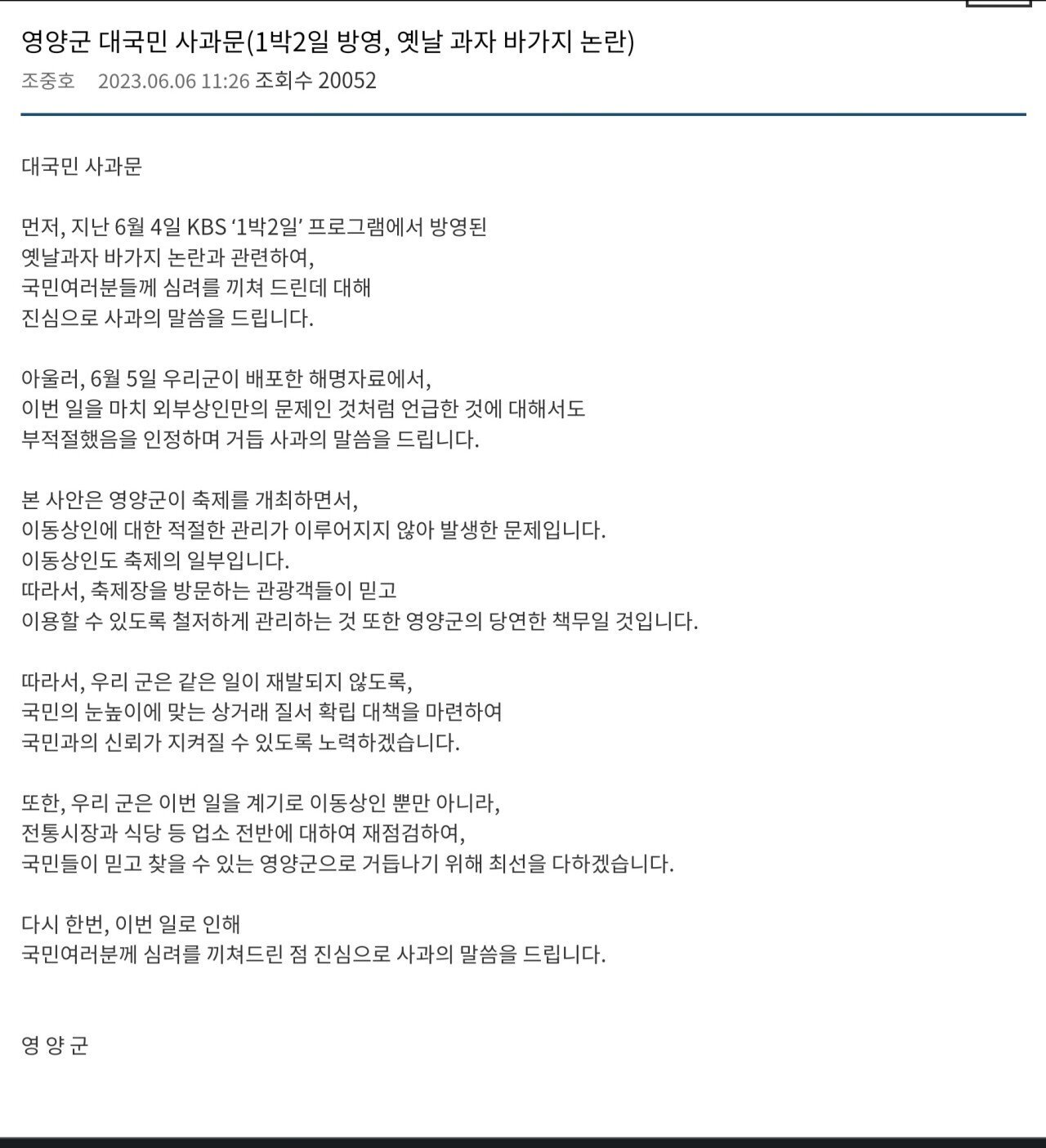 사과문은 뭐 그렇다 치고 공무원이 솔직히 일개 상인 바가지까지 다 바로잡을순 없잖아 솔직히