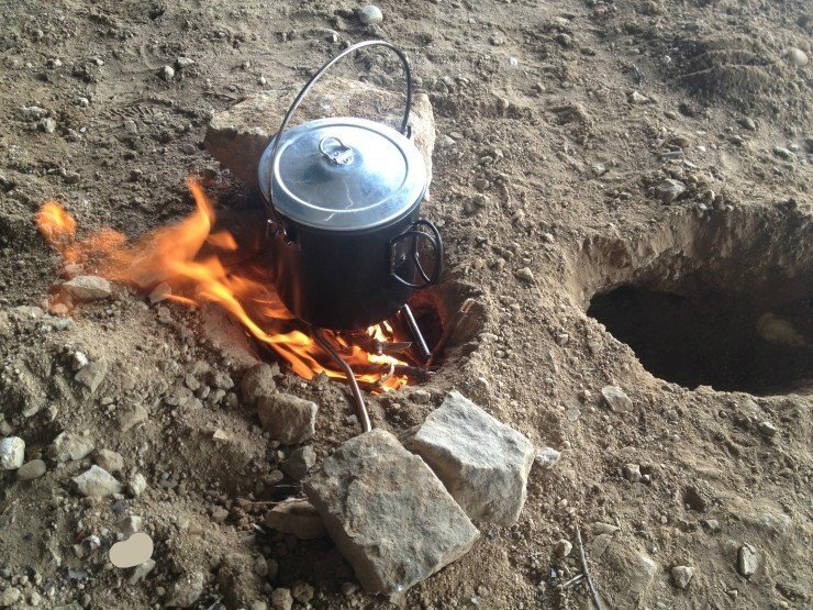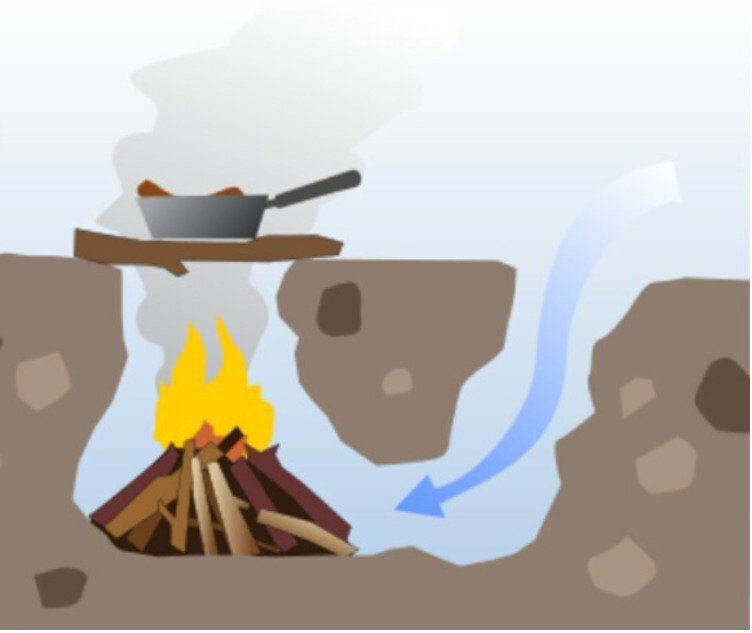미국 인디언들이 개발한 다코타 화덕이다 화덕을 이렇게 파놓으면 바람이 많이불때 안정적으로 연소를 시켜주고 비도 어느정도는 막아주게된다