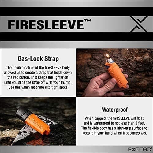 위에 라이터만 쓰기에는 좀 부족하다 싶은 경우 Exotac firesleeve라고 하는 방수 케이스가 있어. 방수 뿐만 아니라 라이터의 가스 스위치를 눌러줘서 지속적인 점화가 가능한 기능도 있어. 부시크래프터들 중에서 쓰는 사람들도 꽤 있더라.