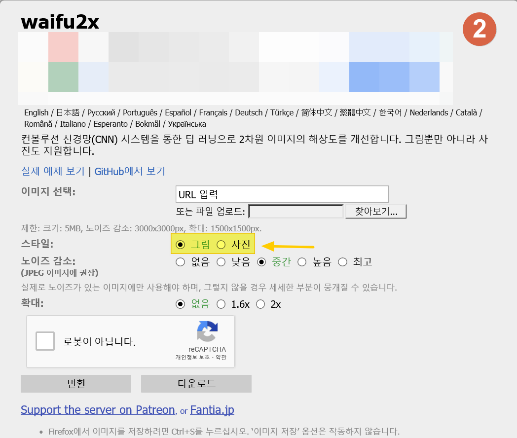 waifu2x 사이트에 들어갔다면 아래 화면이 뜰텐데요. 기본적으로 한국어가 지원이 되니 어렵지는 않지만 waifu2x 사용법을 알면 더 괜찮은 고화질 이미지를 얻을 수 있습니다. 아래 설명 참조해 주세요!