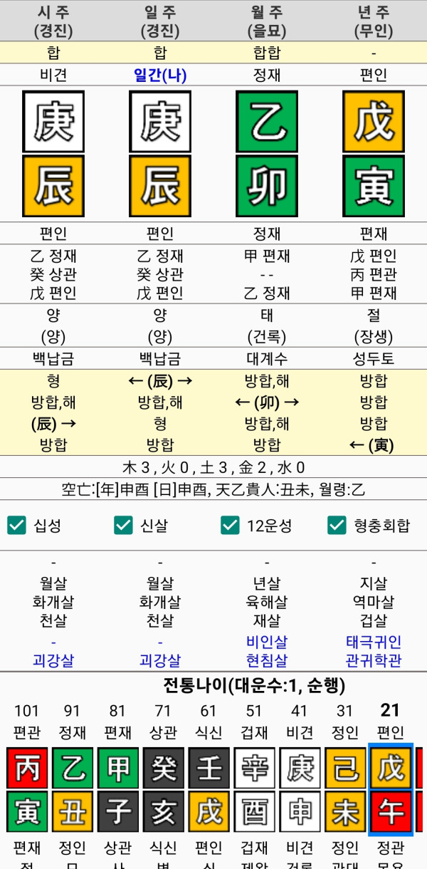 월지 卯(木)는 경금 입장에서 정재(木)고, 절지(힘 빠진 위치)이기 때문에 현실적으로 내가 사회적으로 맞춰야 한다, 고용되어 돈을 벌어야 한다는 압박은 느끼지만 실제로 체감은 답답한 족쇄입니다.
