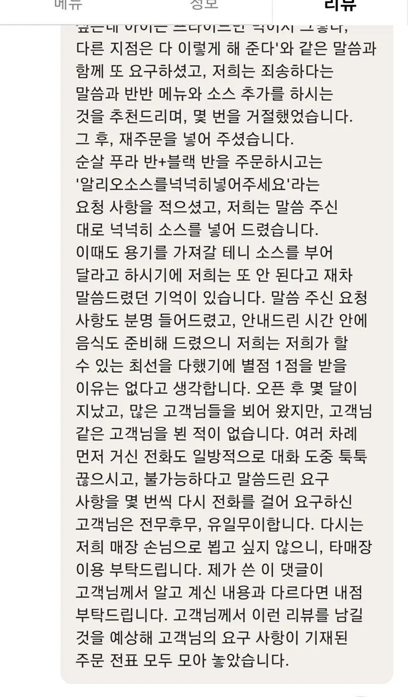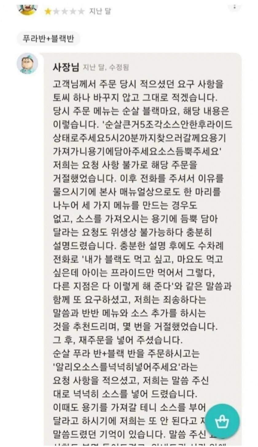 푸라닥 치킨 배민 진상 레전드 아줌마 익명6 1 398 0 0 03.12 21:17 한국이 유독 자영업 하기 힘든이유가 경쟁이 심한것도 있지만 진상 고객이 많은것도 한몫함.저런 이상한 주문은 칼같이 차단해야함이런 사람들은 자기 조절이 힘든 성격이고 정서적 불안정성을 가지고 있을 가능성이 높기 때문임. 감정 조절에 어려움을 겪고, 자신의 불만이나 불편을 극단적으로 드러내는 경향이 있음.이런 성격을 가진 사람들이 사회적 상호작용에서 문제가 발생할 가능성이 큼. 0 0