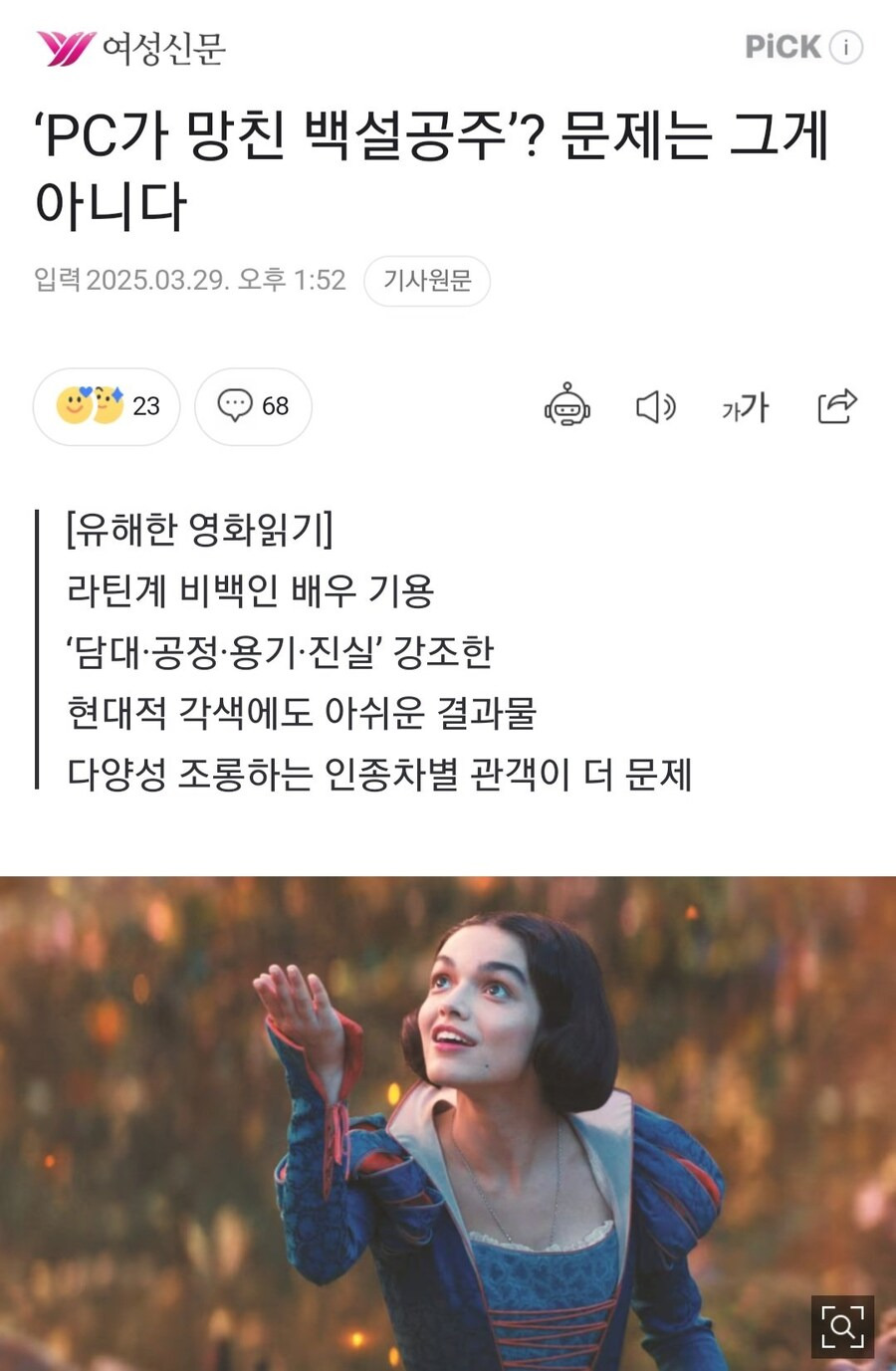 디즈니 백설공주 영화 흥행 실패가 관객탓처럼 적은 여성신문 익명7 1 358 0 0 03.30 13:21 본문을 보면 아이들은 주연 배우가 이쁜 배우를 좋아하는건 가설인 것처럼 적어놓음 ㅋㅋㅋ아이들도 눈은 있다.아니...아이들이 더 외모에 민감하다.실제로 흑어공주때 아이들은 울기까지 했으니....오히려 어른보다 더 호불호가 확실하다.어른들은 배려해준다고 모르는척 하지만 아이들은 더 확실히 표현한다.PC랑 좌파애들은 뭐한거야? 니들이 백설공주 영화 봐주면 되잖아 0 0