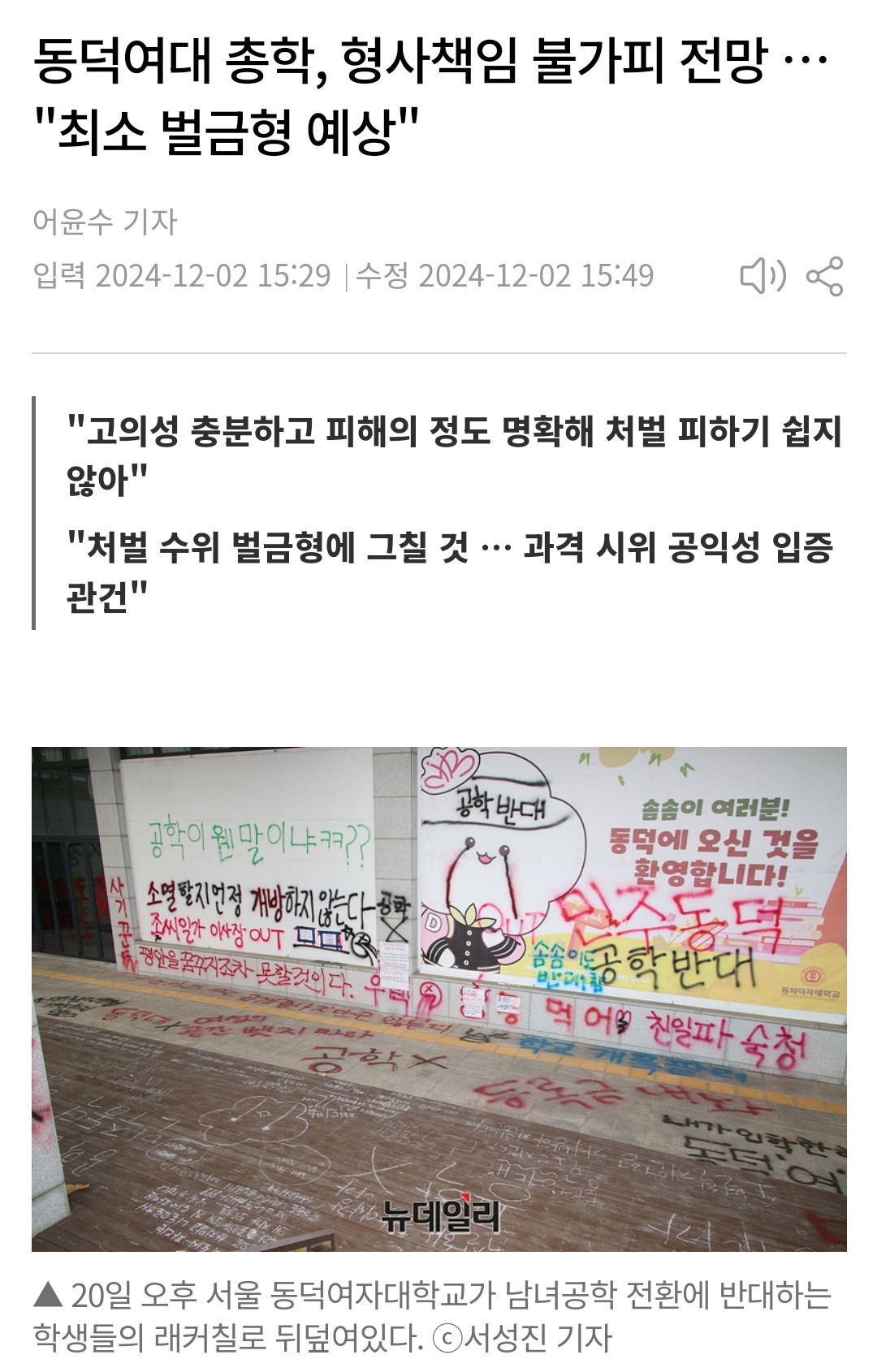 동덕여대 총학 형사처벌 받는다고 함 익명5 1 374 0 0 2024.12.02 19:36 형사처벌 끝나고 나면 민사처벌 들어갈듯.참고로 대기업은 채용 과정에서 신원조회를 통해 벌금형 이력을 확인할 수 있음.면접이나 배경조사에서 탈락하기 떄문에 대기업 입사는 물건너간셈.현재 총학 명의로 21명 고소된 상태고 동덕여대 견적 100억을 21명에서 분담하면 1인당 4억 7619만원씩 부담해야 함. 0 0