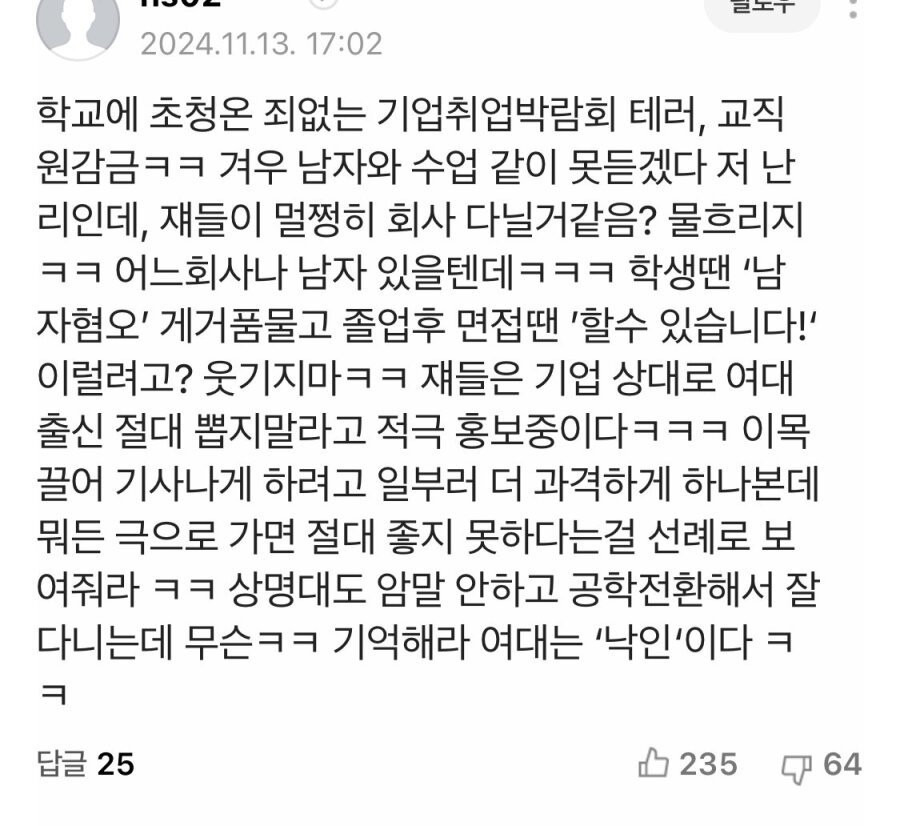 동덕여대 때문에 여대생들 취업 절대로 못할듯 익명9 1 401 0 0 2024.11.15 19:56 공학이 아닌 여대 다니는 것만 봐도 페미일 가능성 엄청날듯.남학생들과의 경쟁에서 살아님기 힘들거 아니 지들끼리만 경쟁하는 여대 찾고 페미가 된 것이 아닐까?이번사태는 동덕, 성신은 물론이고 여대는 걸러야된다는 걸 퍼트려버림.기업도 마찬가지 미래 배우도 마찬가지임.문신한 놈들은 나 착한놈이다를 증명하면서 살아야 하듯이...여대출신들은 나 페미아니다를 증명하고 살게 되어버렸음. 0 0