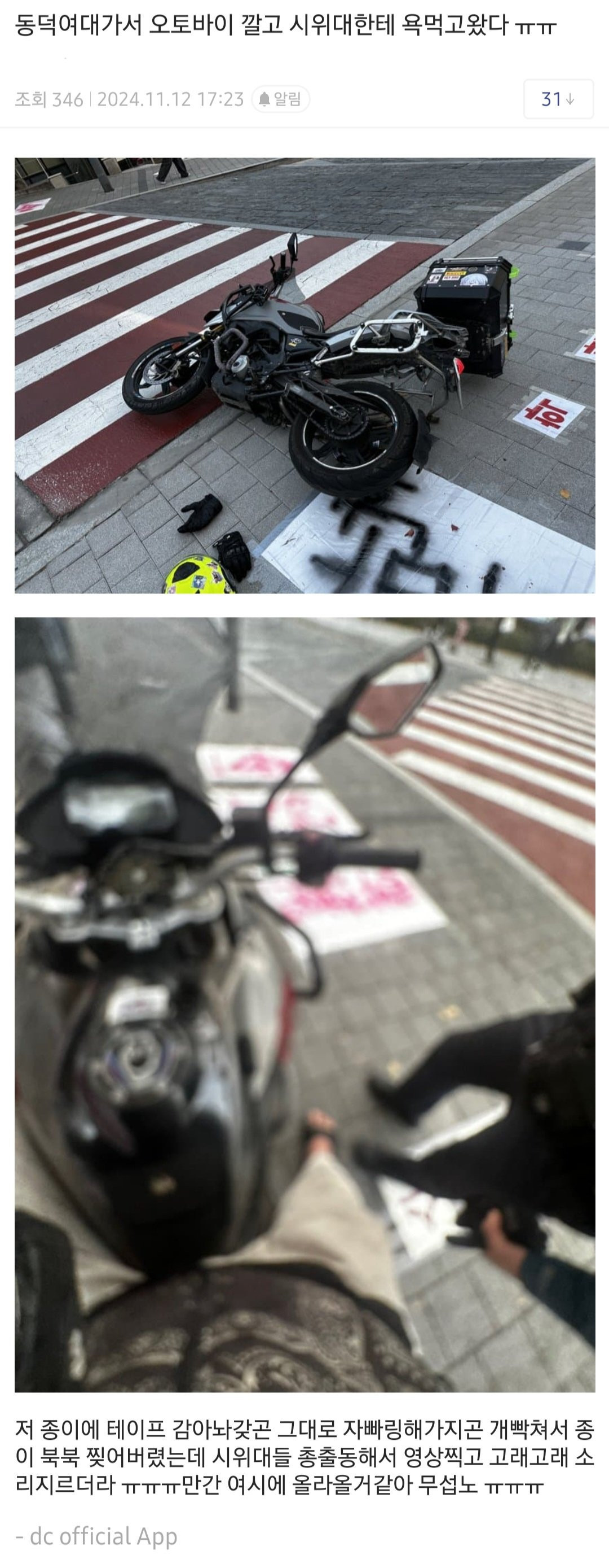 동덕여대에 간 딸배 진짜 진실 익명4 1 397 0 0 2024.11.15 20:34 사실 이 사람은 배달부가 아님동덕여대 사건 터지고 바이크 끌고 구경가서 인도타고 진입하다가 넘어지고 대자보 찢어져 시위대한테 잡힌 것임어쨋든 살아 돌아간것 같아 다행이다 ㄷㄷㄷ 0 0