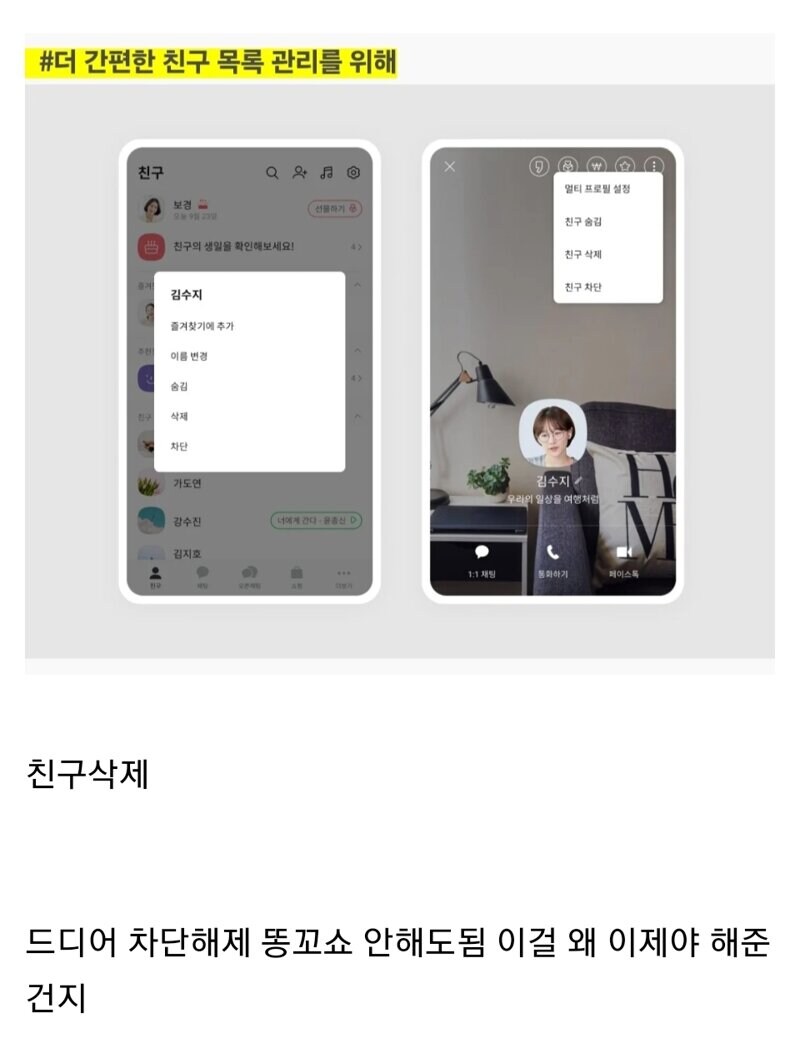 이제야 친구삭제 기능 생긴 카카오톡 ㅋㅋㅋ 익명4 1 552 0 0 2024.08.25 22:57 삭제가 없어서 차단 후 해제를 했는데진짜 빨리도 해준다드디어.. 여러 이유로 연끊긴 분들 영원히 날릴 수 있게 되었음 0 0