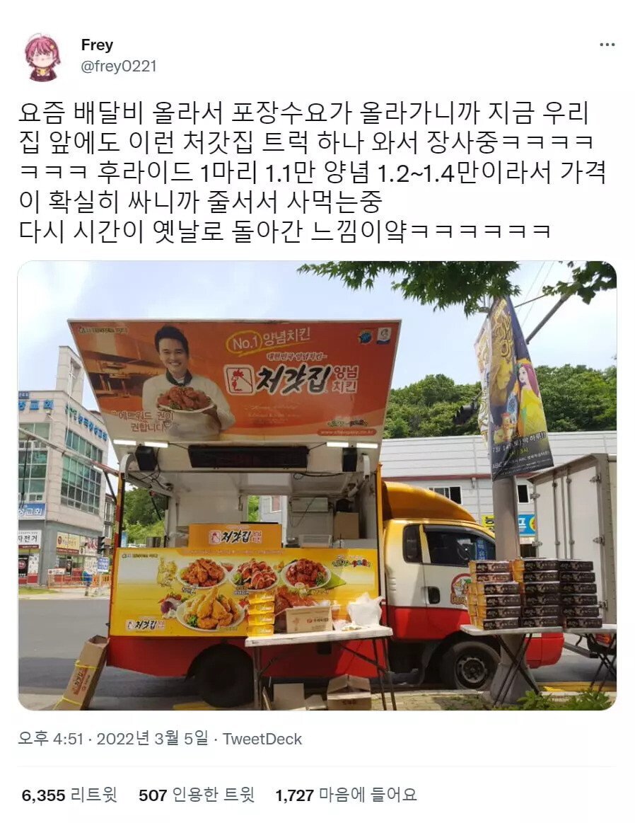 배달비 오르자 다시 유행하는 푸드트럭 익명2 1 1876 0 0 2022.03.07 14:34 아이디어 개 좋네 ㄹㅇ 프차 푸드트럭 개좋다동네 앞에 피자트럭 있는데 장사 개잘되더라 ㅋㅋㅋ 0 0