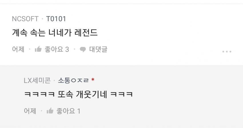 블라인드...NC 직원 일침 익명1 1 1896 0 0 2022.04.01 01:08 하하하 막내야 또 속았구나누가 이렇게 계속 속는거야?이렇게까지 속으면 속은사람이 잘못이다 0 0