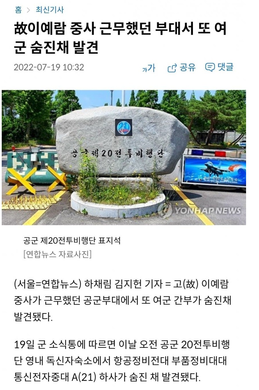 이예람 중사 사건 일어났던 공군 20전투비행단...여하사 또 사망