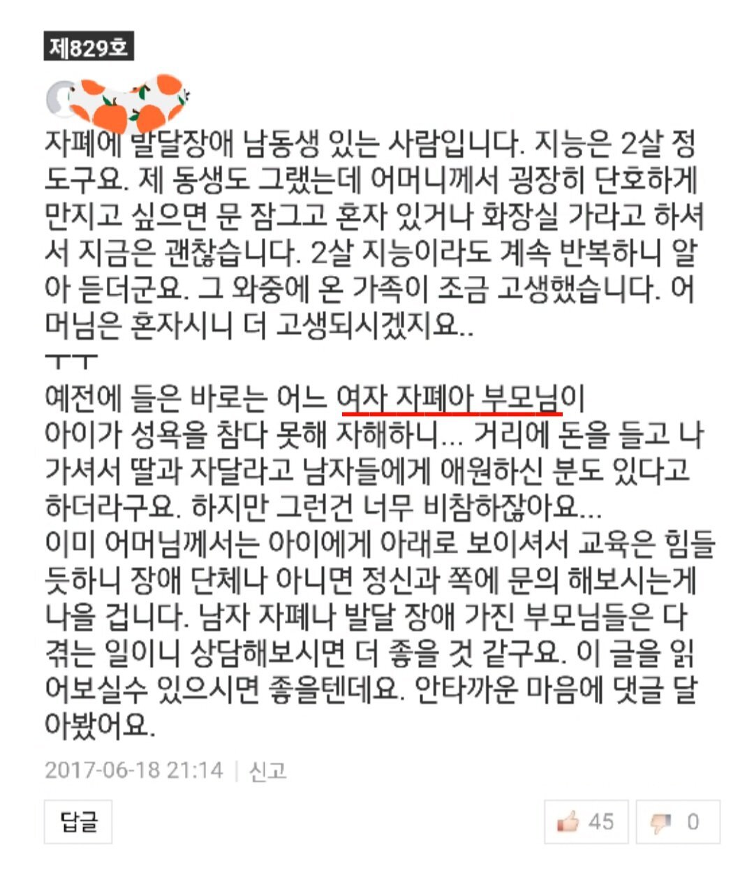남자보다 여아 자폐아 성욕구 통제가 더 힘듬 익명1 1 1874 0 0 2022.08.10 09:20 전라도 데려가면 해결될텐데옛날엔 동네마다 머리에 꽃 꽂고 돌아다니는 능지낮은 여자애들 하나씩 있었음배란기 되면 특히 발정나서 배시시 웃으면서 지나가는 남자들한테 추파 던지고 자기 치마 들추면서 보여주거나 맘에 든다고 남자 뒤 졸졸 따라다니고 했었음.동네 아재들이 옥수수밭 이나 뒷산에 데려가서 돌아가면서 하곤 했었는데 세상 참 좋아졌네 0 0