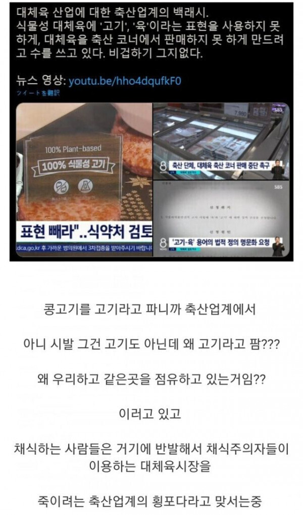 콩고기는 고기라 불릴 자격이 되는가? 익명2 2 1500 0 0 2023.02.01 02:38 방치하면 야자경화유(팜유)가 버터로 되는 꼬라지가 한번 더 생길 수 있음콩고기는 두부보다 한참 맛없으면서 고기인척 함라면에 들어있는 콩고기는 스프를 흠뻑 흡수해서 맛있게 느껴지는데 그냥 생으로 구워 먹어보면 인상이 찌푸려지는 맛이 난다미국에서는 대체육이라는 단어 쓰지 말라고 법원에서도 판결나온 상태왜 진짜 고기도 아니면서 고기 타이틀 달려고 하는건가나중에 그런거 봐주다가 가짜 고기가 진짜 고기로 속이면 어쩔건데 0 0