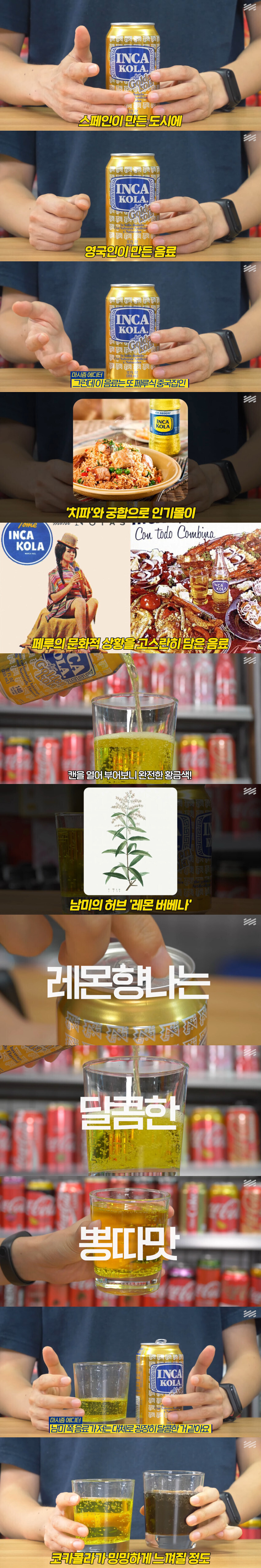 잉카콜라는 바나나향과 바닐라향이 섞인 달콤한 맛이 특징임.