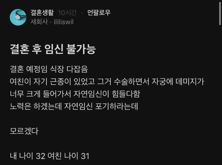 결혼 식장 잡은뒤 자연 임신 힘들다고 고백한 여자