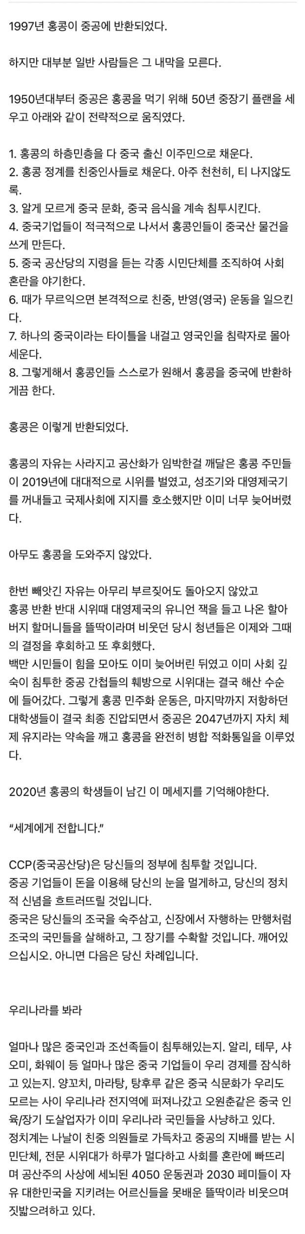 중국 공산당이 돈과 여자의 힘으로 한국 정치인, 언론인들 포섭해서 노예화시켰고 민노총, 전교조 등 중국 추종하는 좌파단체가 수백개씩 있음