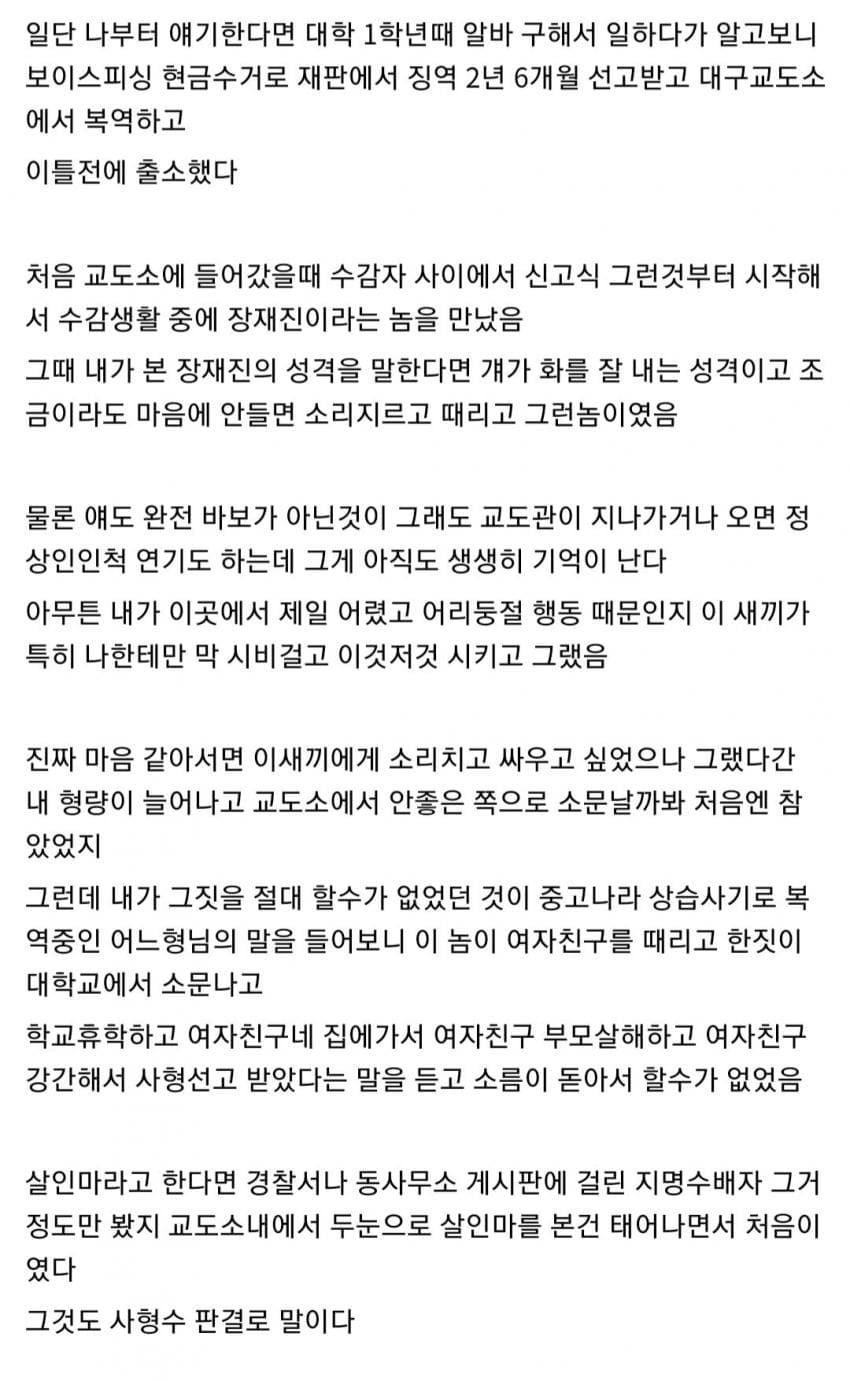 내가 교도소에서 실제로 겪은 장재진에 대한 내용과 장재진 사건에 대한 생각들이다.