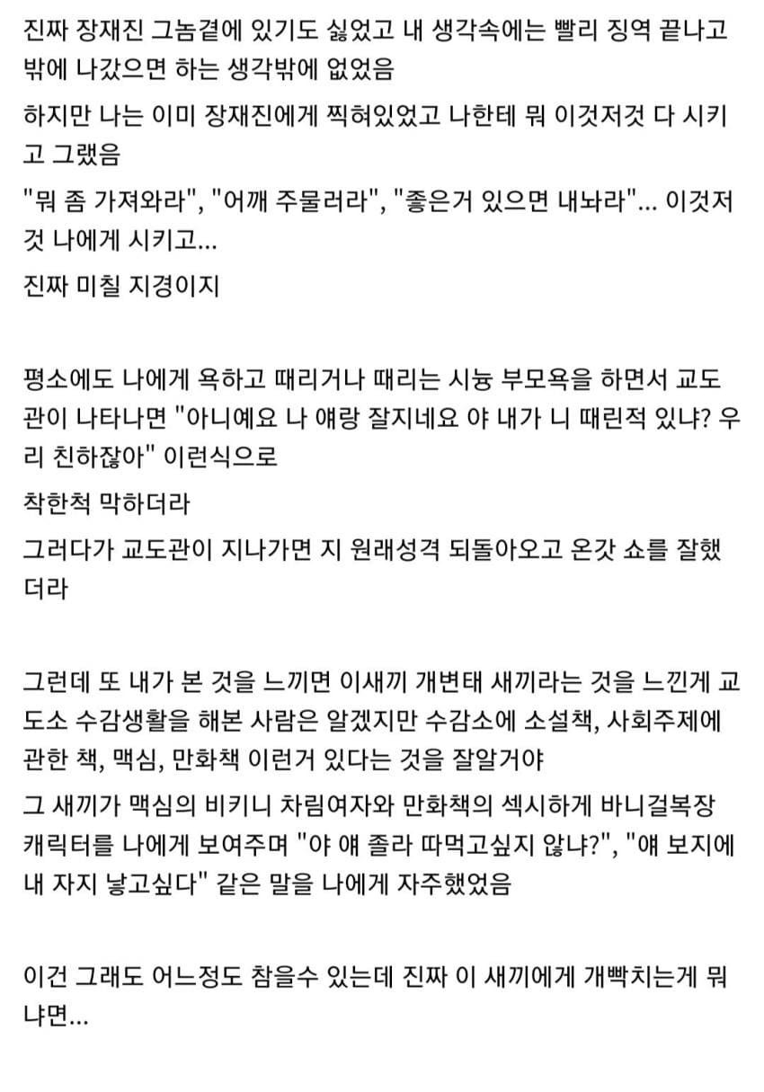 아직 나는 교도소 수감 생활 기간이 남았지만 장재진 그 새끼가 없는것만 해도 기분이 좋았고 열심히 교도소 생활을 보냈다.