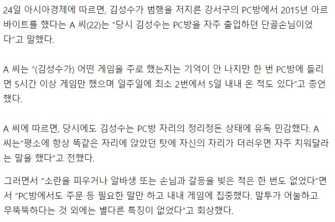 같은 피시방에서 일하던 전 알바생 말에 의하면 김성수는 단골로 맨날 똑같은 자리에서 게임했고 자리가 어지럽혀져 있으면 치워달라고 했다고 한다.