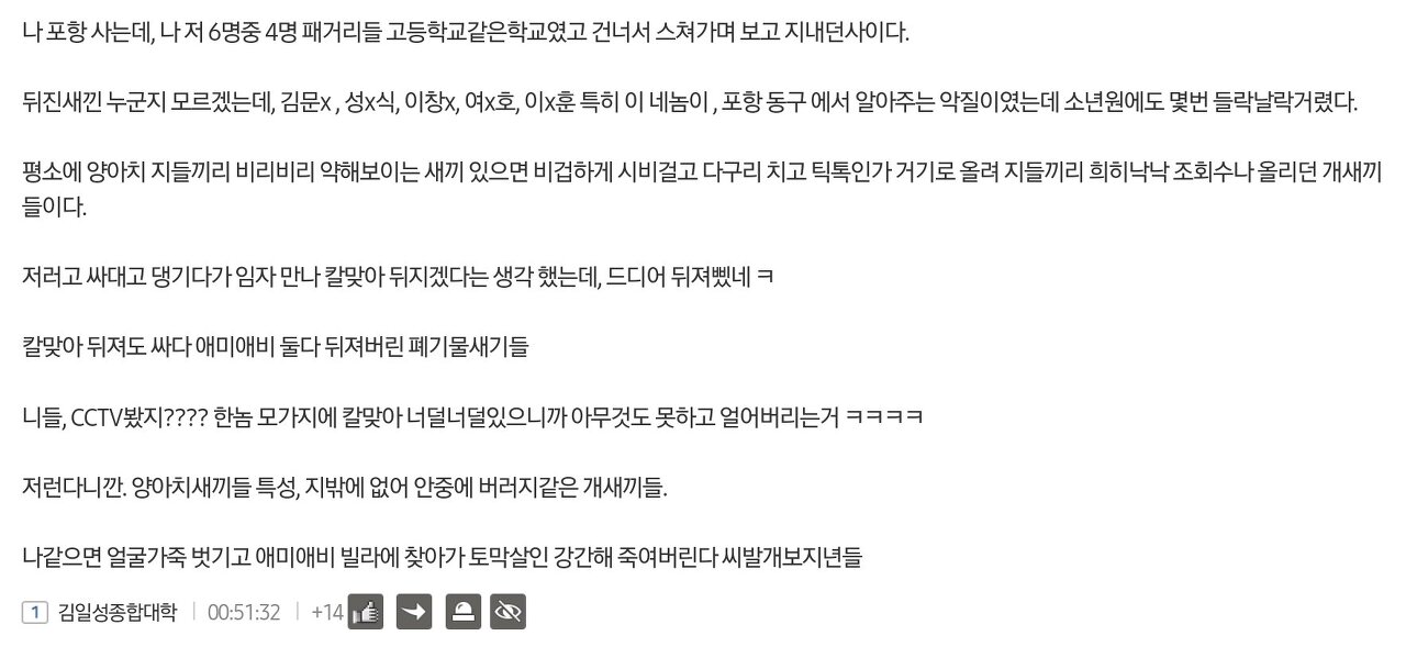 포항에서 놀러온 양아치들 알아주는 악질이였다고 함