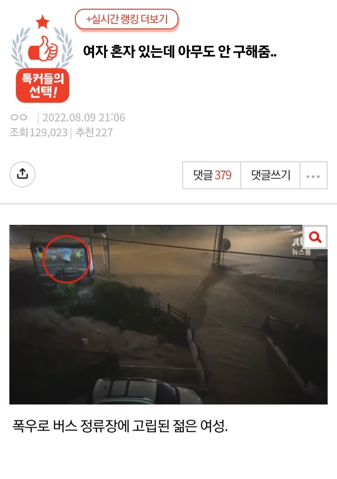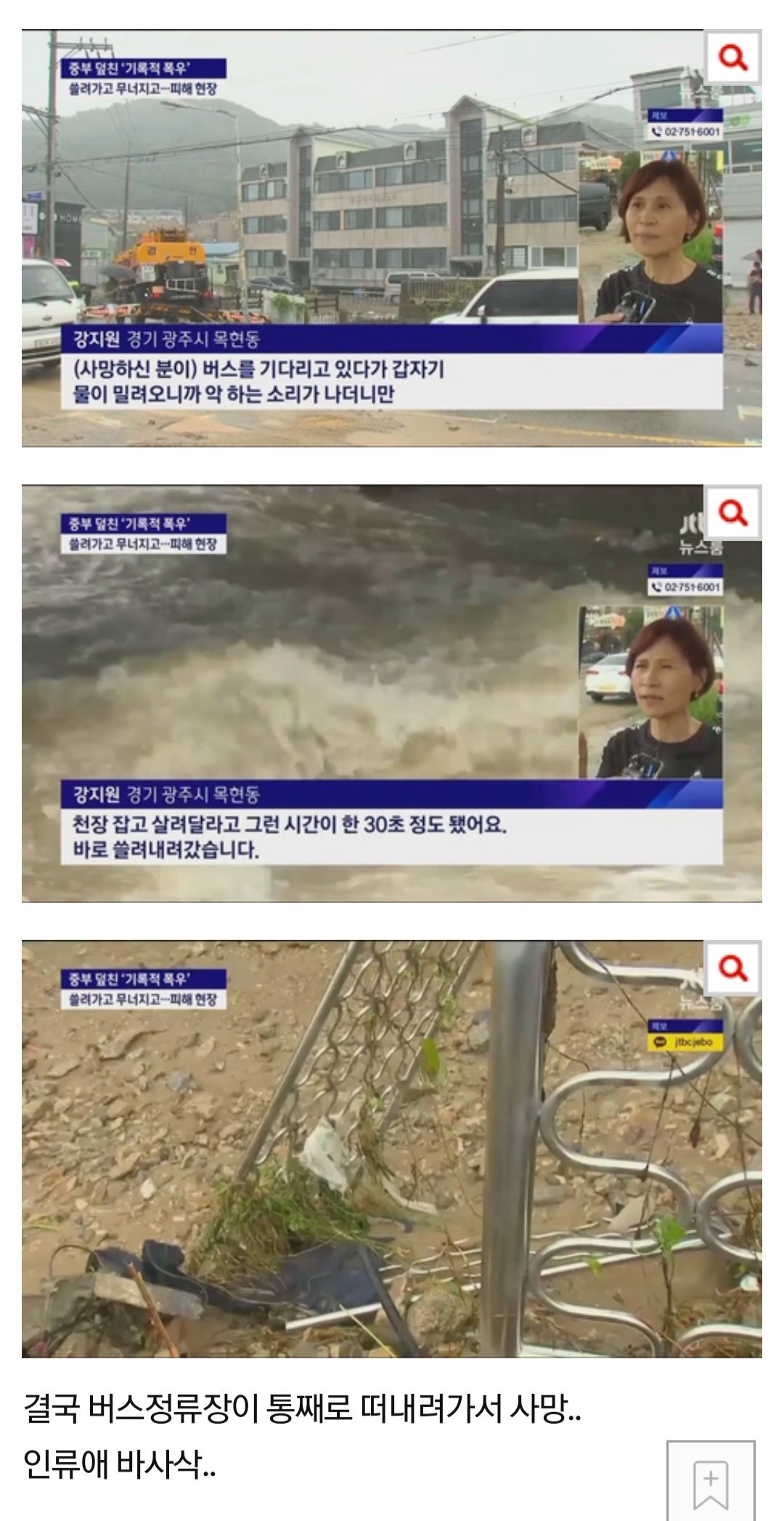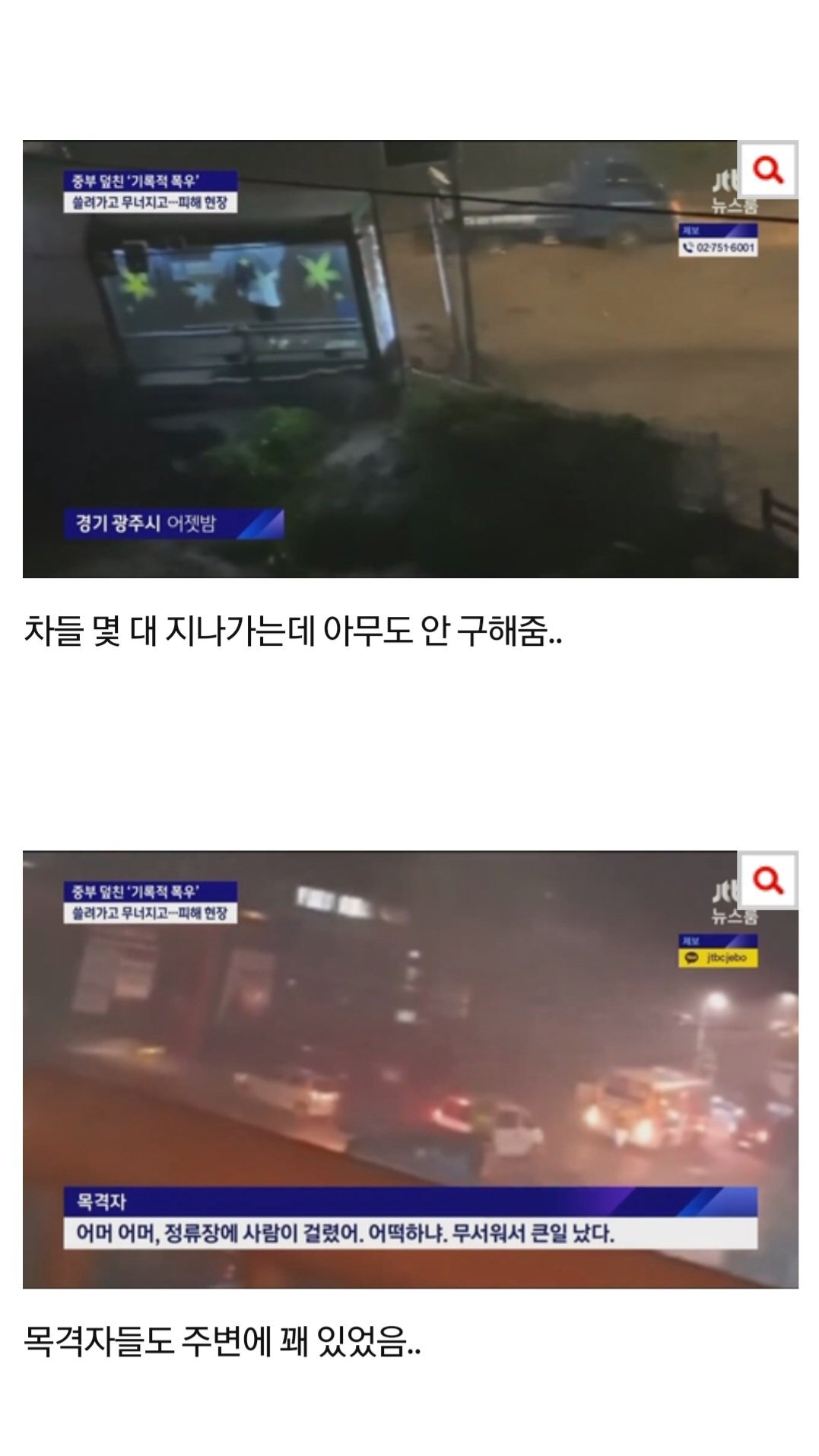 안타깝다설마 버스정류장이 떠내려 갈줄은 상상도 못했겠지글쓴이가 굳이 사람이라고 하지 않고 여자라고 해서 안구해준 사람 비난할 의도로 글 작성한게 참 괘씸해 보임 거기다가 '안구해줌' 이라고 강조함 ㅋㅋ사람의 죽음을 이용해서 남녀 싸움 붙이고 싶을까?보니까 구하러 가면 구하러 간 사람도 저승길 가기 딱 좋은 사이즈인데 말야