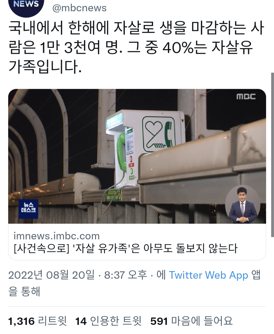 평균 1만 3천명이 자살로 생을 마감한다고 한다
