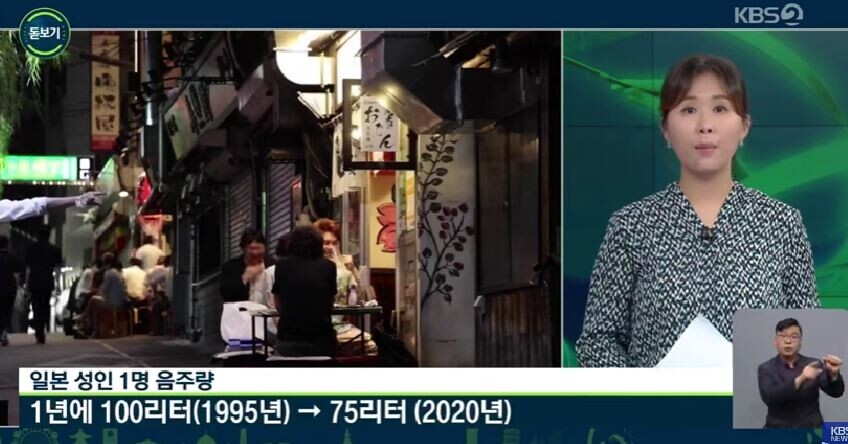 일본 성인 한 사람이 1995년에는 1년에 100 리터 정도의 술을 마셨지만, 2020년에는  75리터로 떨어짐.