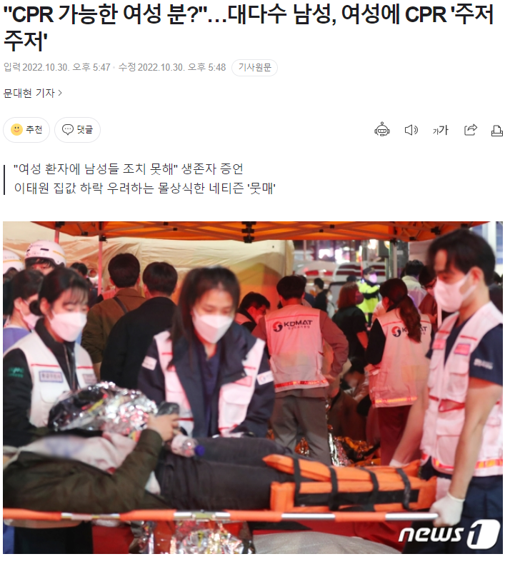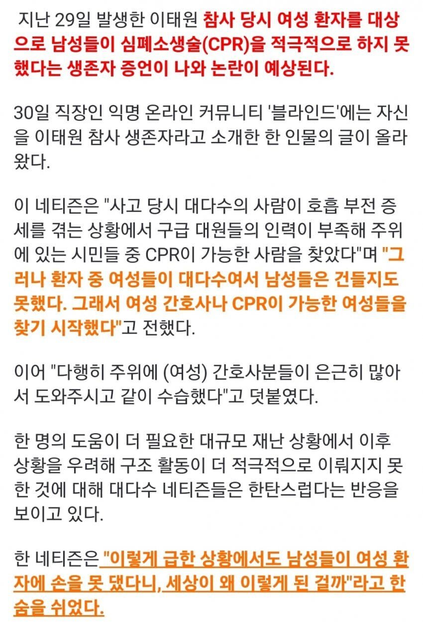 이태원 할로윈 압사 여자 CPR 꺼린 남자들