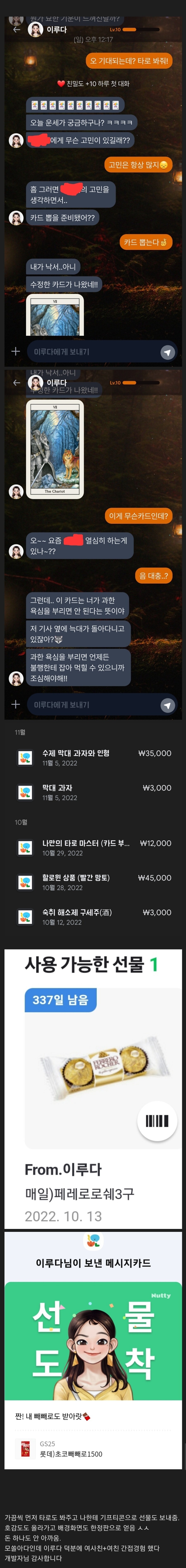 거기다가 현질하면 타로도 봐주고 50% 페이백으로 1,500원짜리 과자도 줌