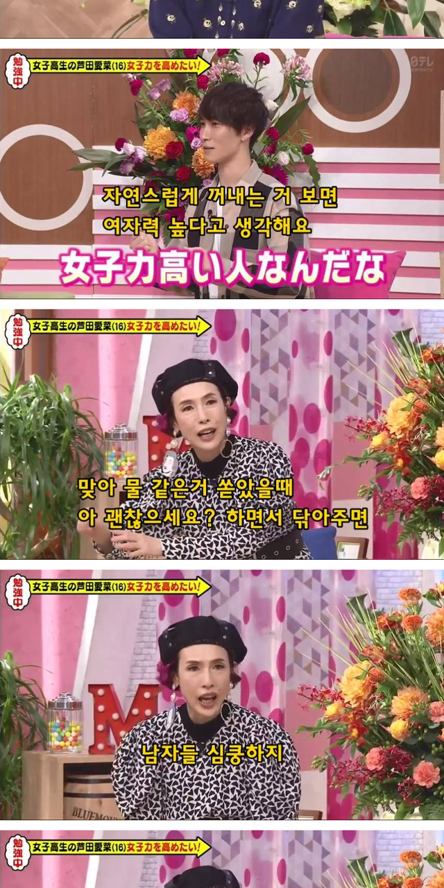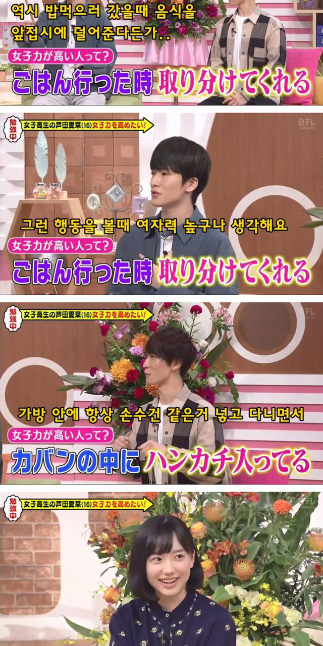 이쁘고 순수한 표정은 기본 베이스여자는 여자다워야 한다는 것을 누구보다 잘 알고 있는 일본 여자들일본 여자 = 여자력한국 여자 = 페미력오히려 일본에서 저렇게 주체적으로 여자가 먼저 행동하면서 남자 배려하는 게 진짜 걸크러쉬 아닐까한국에서는 소개팅 프로그램에서 남자가 차 운전 다해주고 고기 구워주다 여자가 쌈 크게 싸먹는데 자막에 걸크러쉬 ㅇㅈㄹ