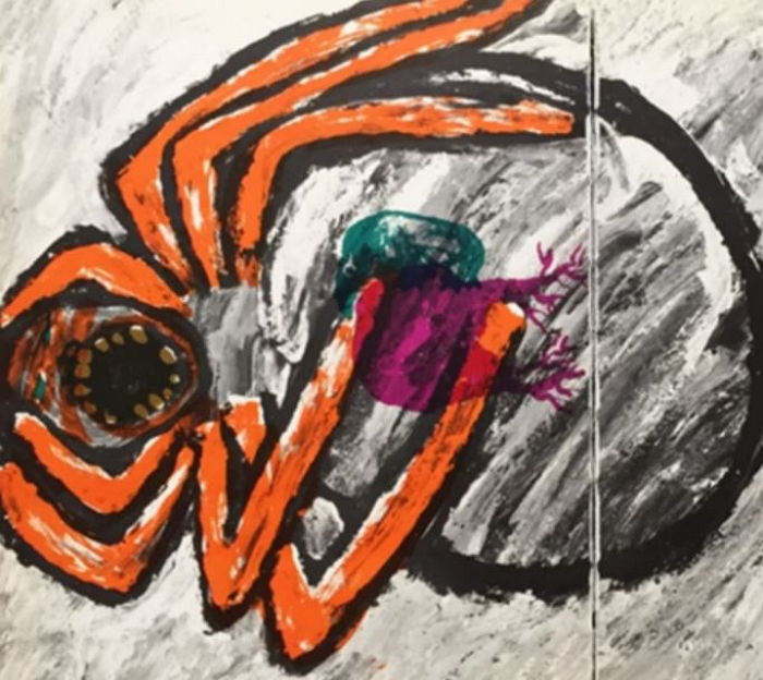 거미 부부에게 노예처럼 살아왔던 개구리는 어느 날 고기 속에 숨어서 거미의 몸 속에 들어가게 됨.
