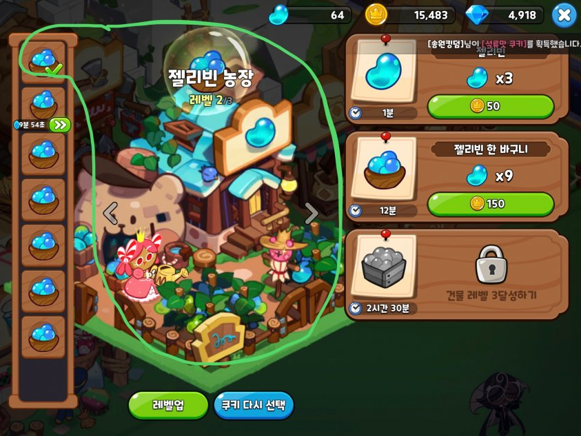 1차재료 건물 중 나무 젤리빈 각설탕은 렙업해도 효율이 늘어나진 않습니다.(나머지는 늘어납니다)