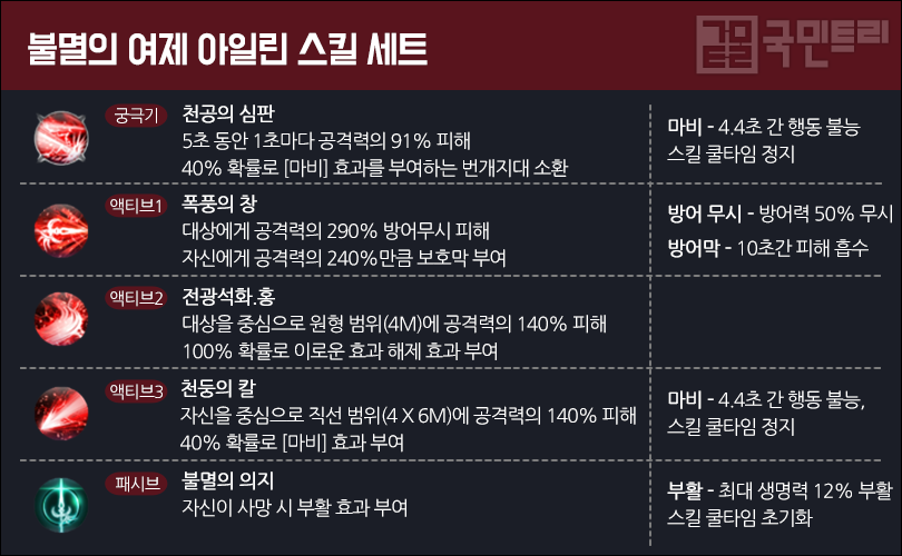 아일린은 궁극기와 액티브3 스킬에 CC기 마비가 붙어있는데 두 스킬 다 40% 확률로 마비를 부여합니다. 궁극기는 캐릭터를 중심으로 시전되는 장판 스킬, 액티브3은 직선 범위 스킬입니다. 다수의 몬스터가 동시에 등장하는 골드 던전, 방치형 필드에서 유용하죠.