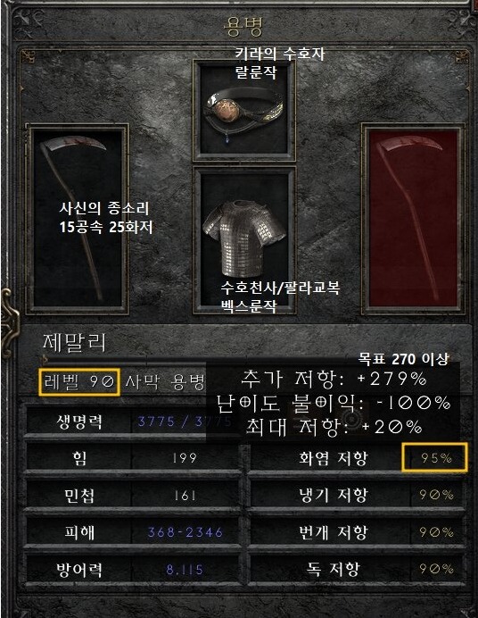 화저 추가저항 합 270 미만 (몹의 선고오라에 걸리면 -75 되는 것을 감안해야 합니다.)