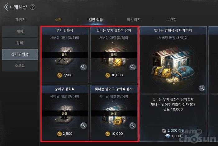 또한 일반 상품 카테고리의 강화 / 세공 탭에서는 무기 강화석과 방어구 강화석, 그리고 빛나는 무기 및 방어구 강화석 상자를 판매하고 있으며 빛나는 무기 및 방어구 강화석 상자에서는 강화 성공 시 +2 강화 수치를 올려주는 빛나는 무기 및 방어구 강화석을 확률적으로 얻을 수 있기에 놓칠 수 없는 기회다.