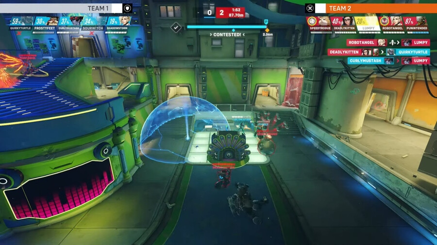 그리고 그렇게 호위해서 자기 편 오브젝트를 체크 포인트로 가져가면 승리다. 개발자들은 동시에 관리해야 하는 푸쉬 오브젝트를 두개 이상 두면 어떨까 하는 생각에서 영감을 얻었다고 전했다.