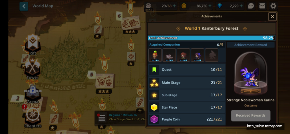 현재 월드1 기준으로 모든 서브맵까지 열면 위와 같고, 서브퀘스트 한개는 추후에 다른 월드에서 얻어야 깰 수 있는 퀘스트템이 있어서 진행도가 98%이다.