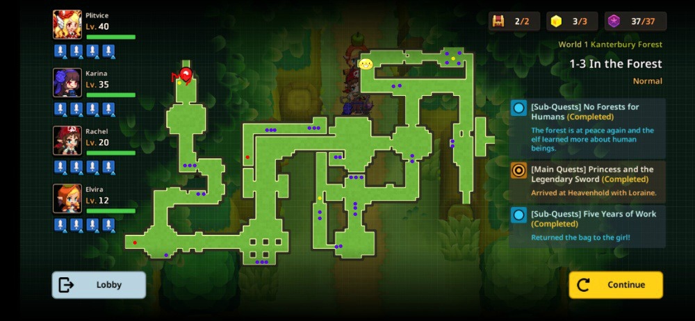 월드1에서는 총 5명의 동료를 얻을 수 있고 1개의 메인 퀘스트와 10개의 서브퀘스트가 존재한다.