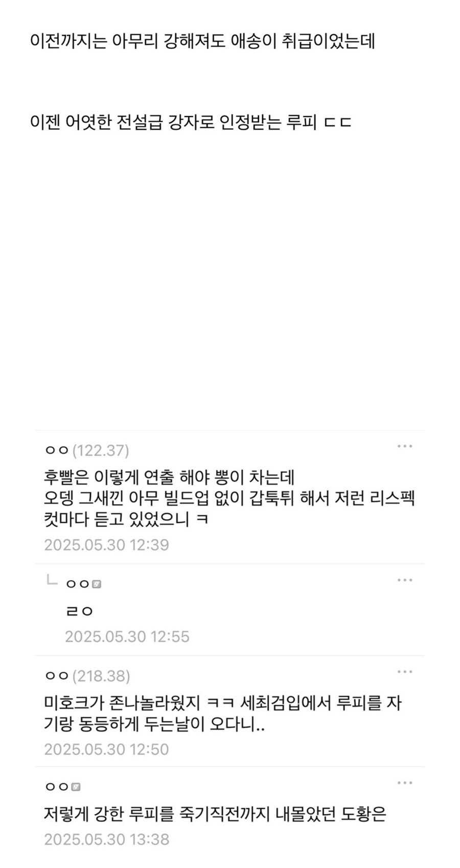 킹덤이 원피스 보고 좀 배웠으면 좋겠다 이신은 그렇게 네임드들 많이 쓰러트렸는데 아직도 쩌리 취급당하는중